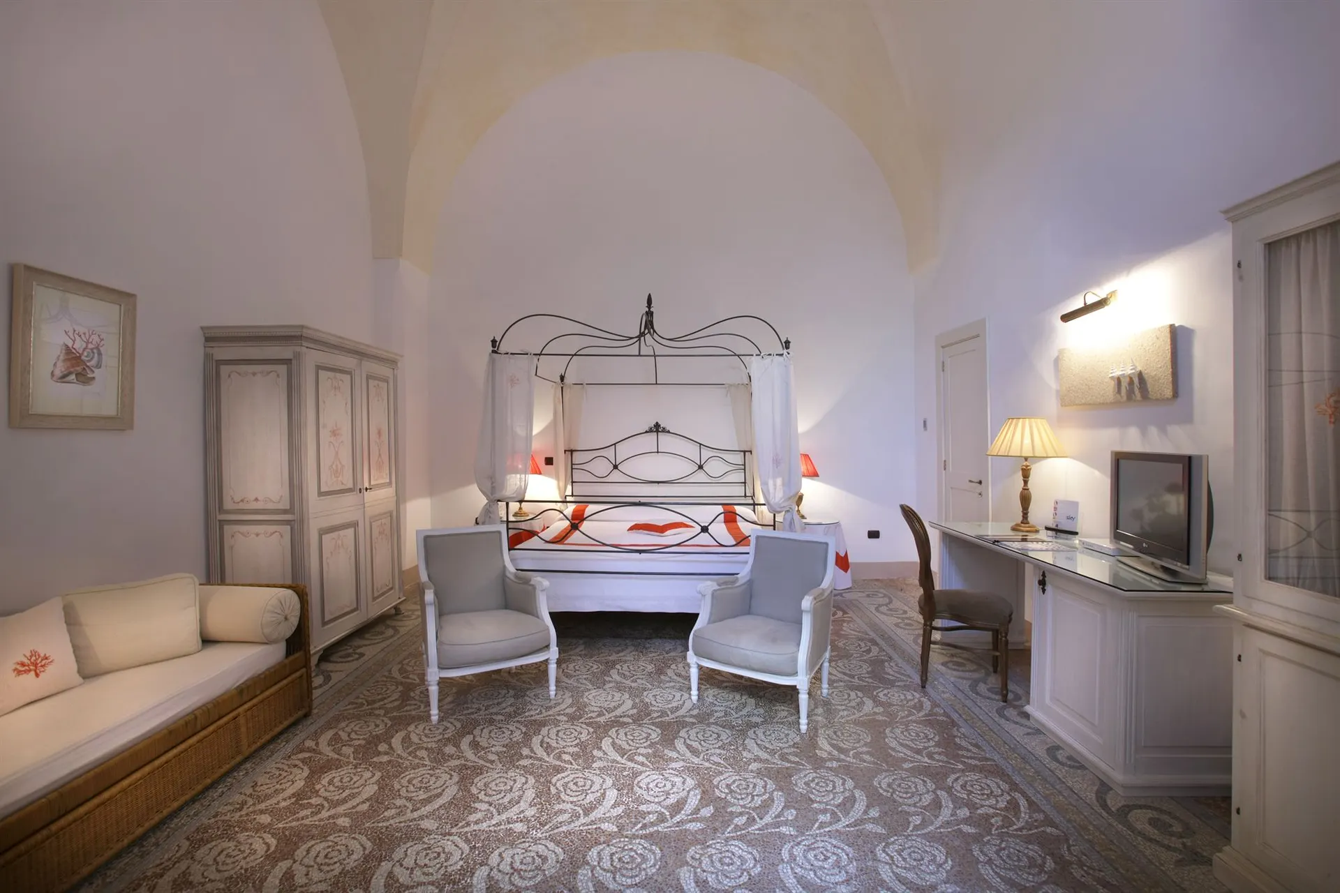 Le Mosco Palace, une charmante demeure du XIXe siècle, est niché au cœur du centre historique de Gallipoli. Entouré de rues chargées d'histoire et de tradition, c'est l'endroit idéal pour des vacances à la mer, à proximité d'attractions culturelles. Le Palace est réputé pour sa magnifique terrasse panoramique surplombant le golfe de Gallipoli, parfaite pour des cocktails romantiques au coucher du soleil ou pour se détendre dans le bain à remous. Pendant les mois les plus chauds, un généreux petit-déjeuner est servi sur la terrasse, tandis que par temps plus frais, les clients savourent un délicieux petit-déjeuner composé de gâteaux faits maison dans une salle de petit-déjeuner exclusive, aménagée dans une ancienne échoppe historique. Un bain à remous sur le toit est disponible moyennant un supplément, idéal pour déguster des apéritifs ou regarder le coucher du soleil. Les chambres et le mobilier reflètent le style du XIXe siècle du bâtiment. Certaines chambres conservent les mosaïques et les œuvres d'art d'origine, ce qui ajoute à l'ambiance historique. Chaque chambre est aménagée avec soin, alliant fonctionnalité et souci du détail pour répondre aux besoins des voyageurs modernes. Certaines chambres donnent sur les charmantes ruelles du vieux village et sur la cour intérieure. Toutes les chambres sont équipées de la climatisation à réglage individuel, de télévisions LED, de mini-réfrigérateurs, de téléphones à ligne directe, de coffres-forts, de sèche-cheveux et d'articles de toilette gratuits. La plage de sable la plus proche, la plage de la Pureté, gratuite et non équipée, se trouve à quelques pas de la résidence. D'autres plages de sable équipées se trouvent à 1, 5 km, avec un service de navette disponible sur demande.