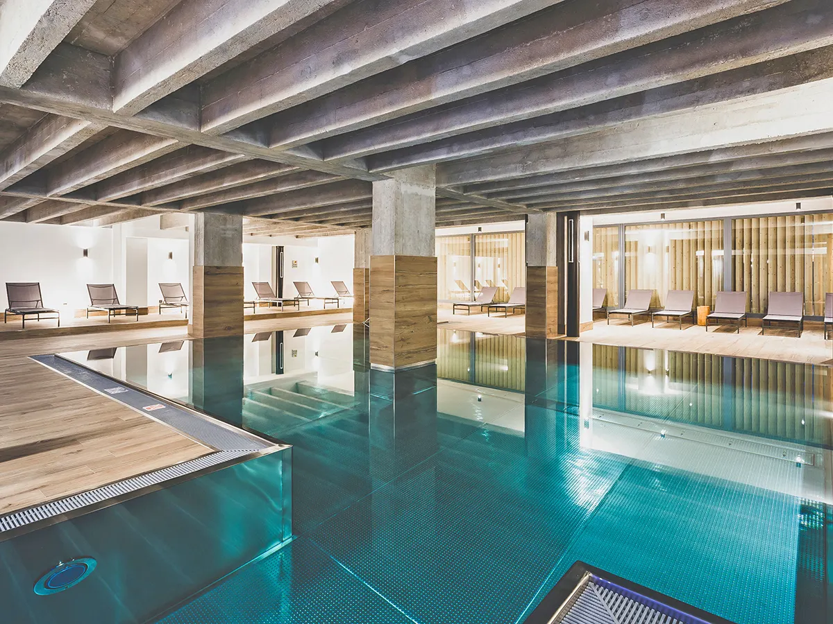 - Wellnessruimte (ca. 750 m²) met binnenzwembad met massagestraal en aangesloten, verwarmbaar buitenzwembad, saunagedeelte met sauna, sanarium, stoombad, evenals een ontspanningsruimte binnen en buiten.