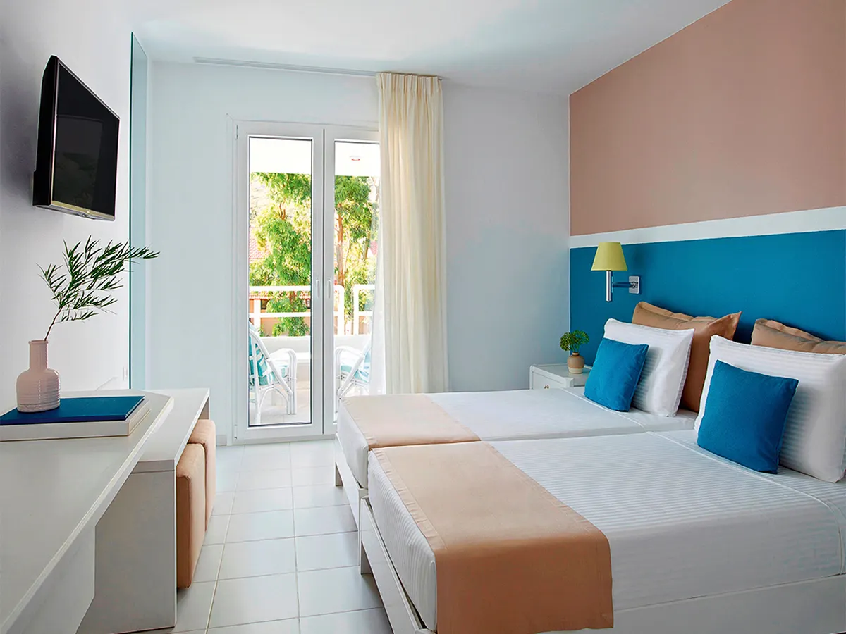 - Tweepersoonskamer (DZ, ca. 16 m²), airconditioning (25.05.-25.09.), koelkast, tv, WiFi, kluis. Douche, toilet, haardroger. BK. Max. 2V<br>Tweepersoonskamer (DSM, ca. 16 m²), gerenoveerd (tot 30.10.25), airconditioning (25.05.-25.09.), koelkast, waterkoker, tv, WiFi, kluis. Balkon en zijdelings zeezicht. <br>Naar keuze met direct zeezicht (DZM) of terras en tuinzicht (DZG) te boeken. <br>Superior-tweepersoonskamer (DSP, ca. 20 m²), extra slaapbank, airconditioning (25.05.-25.09.), koelkast, waterkoker, tv, WiFi, kluis. Terras met tuinzicht en ligbedden.