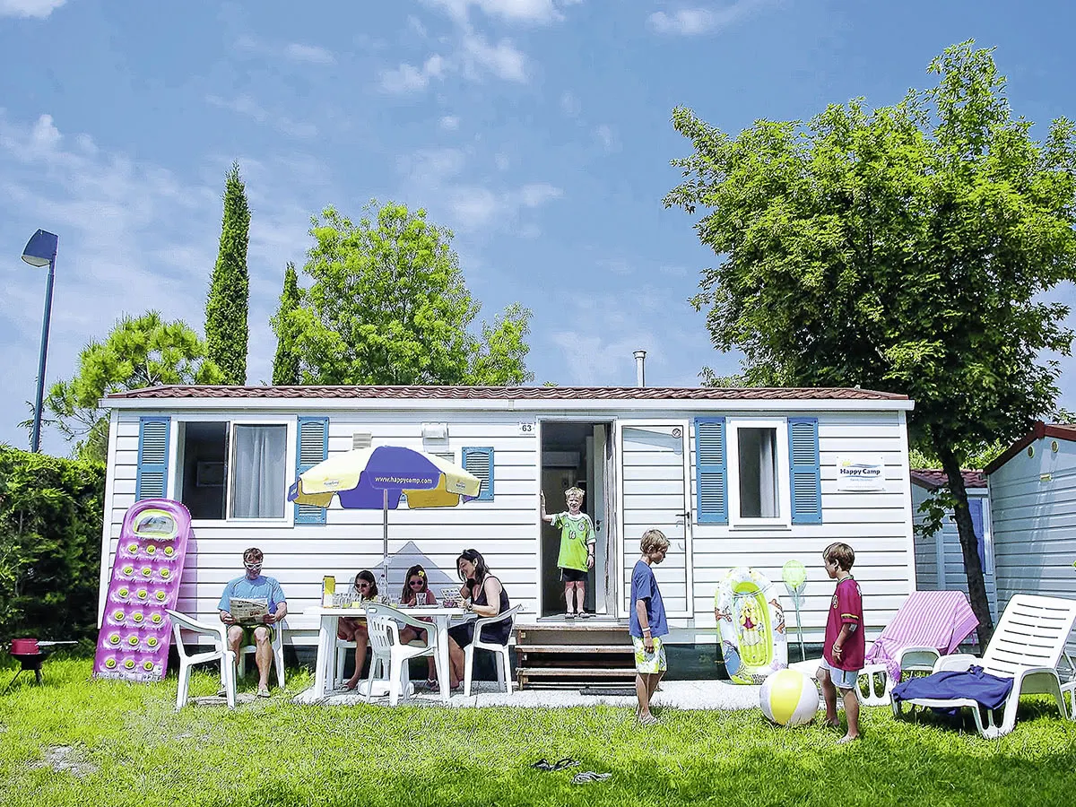 - Stacaravans (MH6, ca. 25 qm), type Happy Easy, eenvoudig uitgerust, gecombineerde woon-/slaapkamer met slaapbank, 2 ap. slaapkamers (1x met tweepersoonsbed en 1x met 2 eenpersoonsbedden en 1 opklapbed voor kinderen tot 1,50 m/60 kg), airconditioning (op aanvraag, ca. 5 euro per dag), kitchenette. Overdekt houten terras, kleine elektrische barbecue.