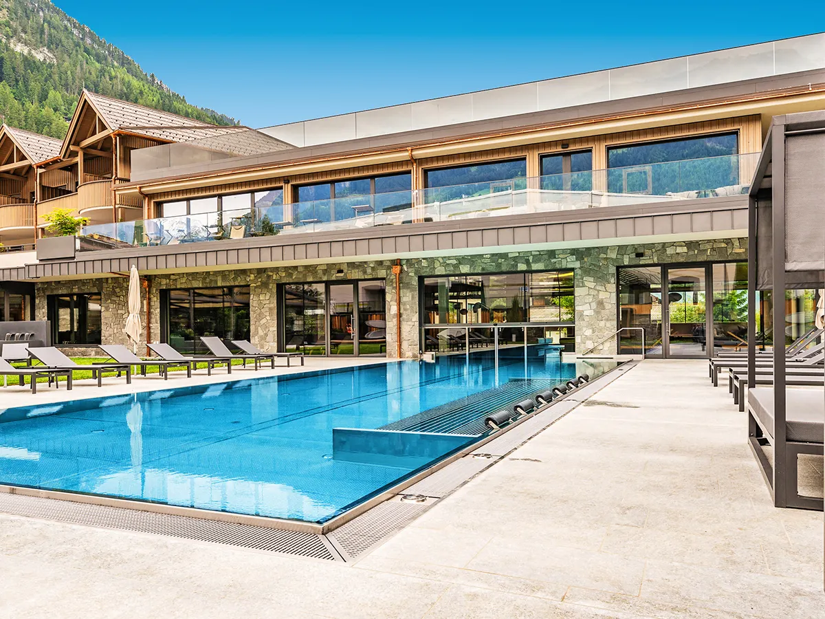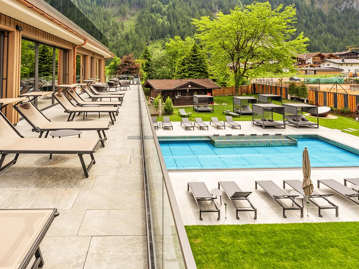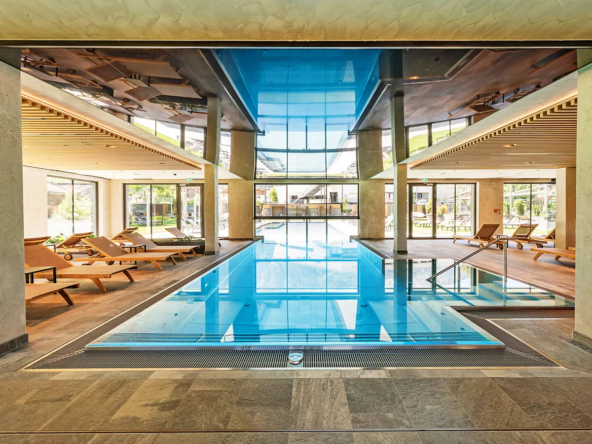 - Fitnessruimte<br>Wellnessruimte (ca. 1.000 qm) met buiten- en binnenzwembad, tuin-spa, 2 Finse sauna's, kruidensauna, stoomsauna, infraroodcabine, lounge, ontspanningsruimte met gezellige daybeds alleen voor volwassenen