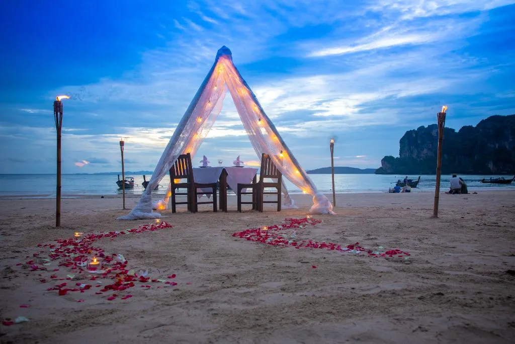 Dit luxueuze resort heeft een toplocatie aan Railay Beach, dat bekend staat om zijn adembenemende zonsondergangen. Deze kustplaats in het zuiden van Thailand biedt een tropisch paradijs, ideaal voor onvergetelijke familievakanties of romantische uitjes. Gasten kunnen attracties in de buurt verkennen, zoals Phranang Cave en de verborgen lagune. Krabi International Airport ligt op 45 minuten rijden, terwijl Ao Nang en Naam Moa stranden bereikbaar zijn met een longtailboot in 15 minuten. Een selectie van villa's toont traditionele Thaise decoratie, met natuurlijke materialen zoals hout. Voor extra luxe biedt de Hot Tub Villa extra ruimte en een eigen veranda. Gasten kunnen dineren in het unieke restaurant aan het strand en genieten van ontspannende massages in de spa.