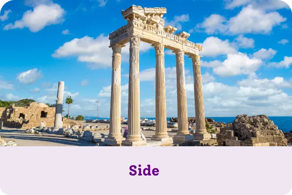 Ben je een echte cultuurliefhebber? Dan moet je tijdens je reis aan de Turkse Rivièra zeker de Antieke Steden Perge en Side bezoeken. Je kunt er rondwandelen tussen goed bewaarde ruïnes en er de rijke geschiedenis van de regio ontdekken. Bij Perge vind je een archeologische site met een episch theater, een tempel van Artemis en een palaestra. Side kent een tempel van Apollo en Dionysus, zonen van Zeus. Ook Myra is zeker de moeite waard. Het Romeinse theater en de indrukwekkende necropolis zijn er schitterend om zien. Wil je goed kunnen genieten en zo veel mogelijk zien? Dan bezoek je deze sites best heel vroeg op de dag ofwel vrij laat.